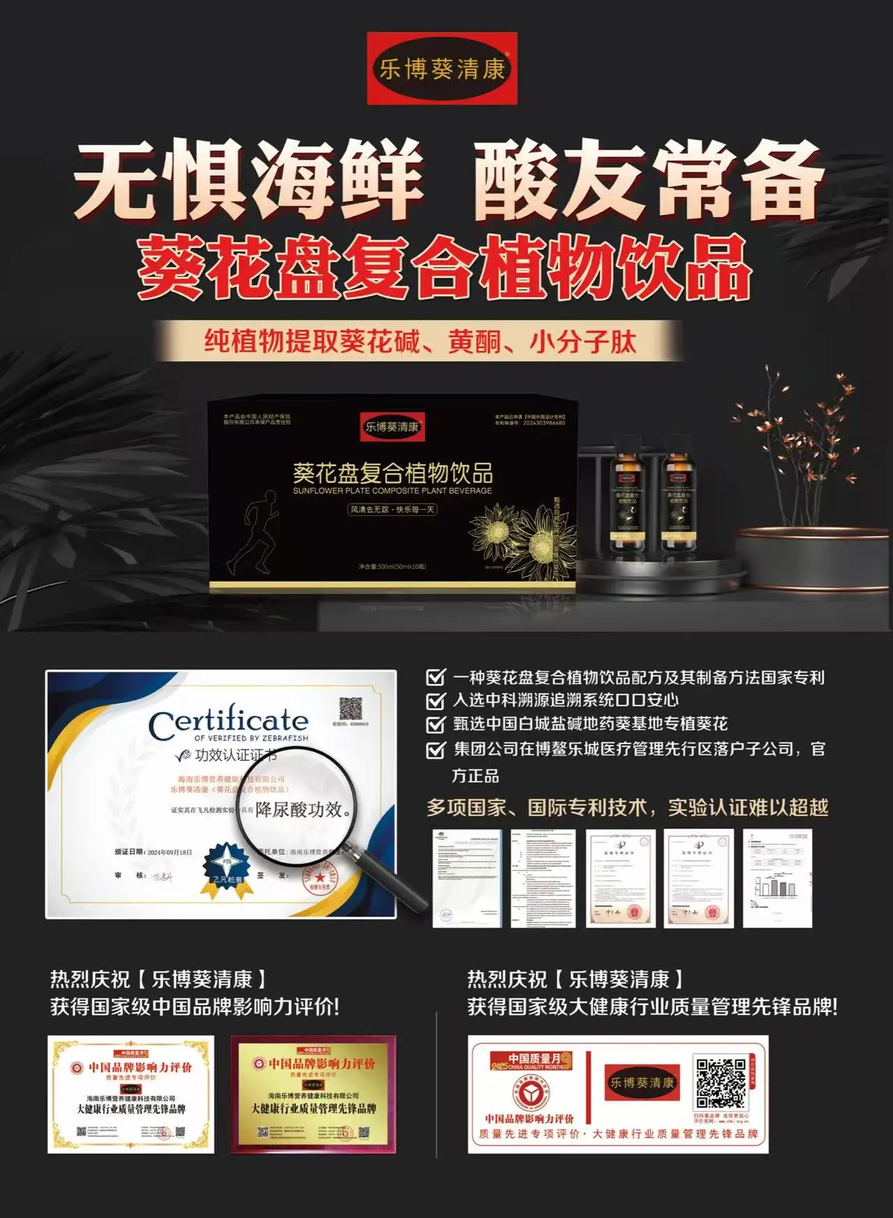 葵清康是无数痛风、高尿酸患者的“救星”——葵花盘复合植物饮品。先和大家说一个关键背景:海南乐博的注册地是博鳌乐城国际医疗先行区管理局001号企业,能拿到这个“001号”资质,意味着企业的研发实力、生产标准都经过了国际医疗先行区的严苛审核,这本身就是对产品最硬的背书。而这款葵花盘饮品,正是公司历时多年打磨的第三代升级产品,从种子培育到终端产品,全链条自主可控,没有任何外包环节,品质绝对有保障。